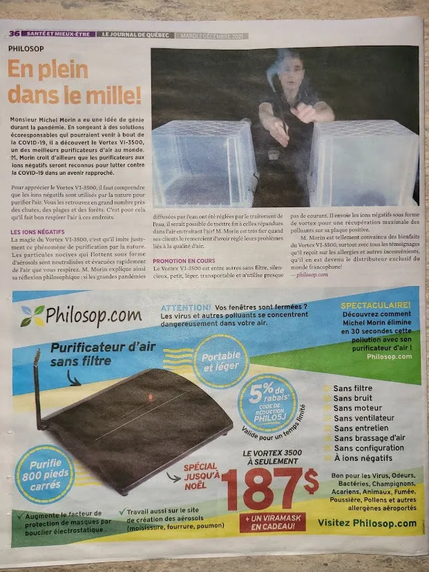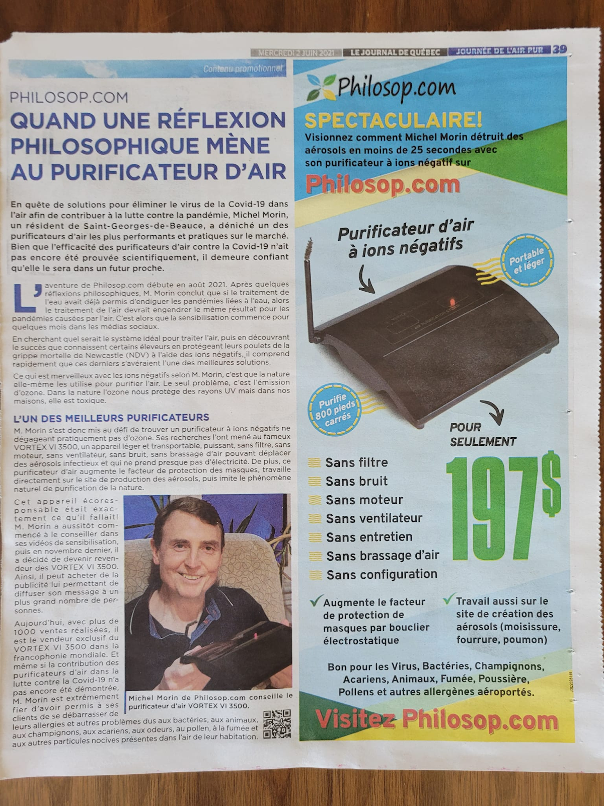Journal de Québec - Article sur notre ancien site philosop.com. Quand une réflexion philosophique mène au purificateur d'air !